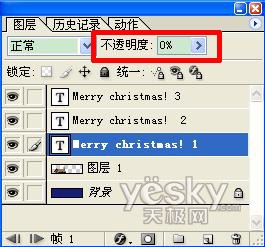 将动画调板中A、B两帧位置进行互换,并在图层调板中,将3个文字层的填充不透明度都改为0%。