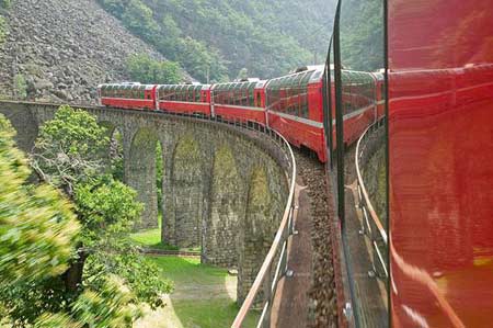 阿尔卑斯山脉最高的铁路线,最高处海拔7405英尺。整条线路连接着瑞士的圣莫里茨与意大利的蒂拉诺。途中的一些弯角角度很大,你甚至可以从车窗里拍摄到车尾的样子。最后的亮点是布鲁西 欧的高架拱桥,在这里火车会沿着河谷的方向作出360°的大回旋,让人叹为观止。