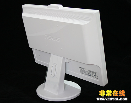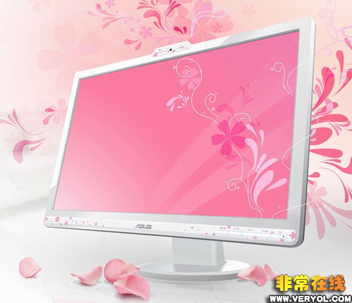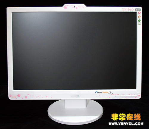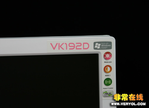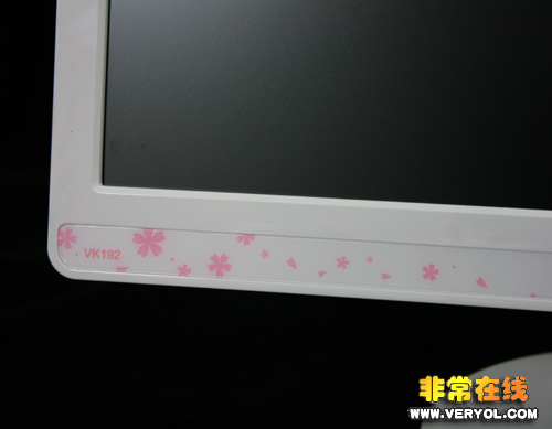 华硕VK192D是一款通体纯白色系的宽屏液晶显示器,正中和左右下角点缀以淡粉色的小碎花,有了这些装饰,那些喜欢往显示器上贴装饰品的Office Lady们有福了,不用再费力的去做选择:到底是贴哆啦A梦还是贴“那位”。
