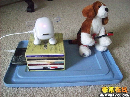 它对音乐的感应有两种方法,可以通过音频线把I—DOG作为一款音箱,I—DOG就会随着节奏做着不同的动作;也可以在拔开音频线的时候,通过IDOG机身的麦克风感应四周的声音,而做出不同的节奏动作!
