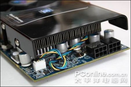 从侧面窥探的显卡供电部分,扎实的电容堆与大量做工一流的贴片元件让人很容易感受到气势不凡。根据蓝宝资料介绍,这款HD4870黄金版采用的是独家开发的非公版PCB,使用了核心3相+显存2相的供电方案,每相使用4只TDSON-8封装的优质Mosfet与两个并联的电感,全数配搭日本化工NCC的固态电容,打造同样暴力的澎湃供电系统。