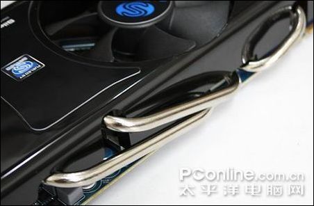 采用与蓝宝顶级Toxic毒药类似的散热架构,主要使用铜铝结合设计,由较大面积的铜迅速将核心所发出的高热吸收,再由三条热管将核心的热量带到散热器前后的鳍片上,利用铝质散热快的特点,结合位于散热器中间的8CM风扇所带出的风量将热量带走,热交换效率高,整体简单而高效。其中位于中部的8CM散热风扇是采用了4PIN PWM温度控制,能够根据核心的温度而智能改变转速,无论2D还是3D状态都将温度控制在最低水平。