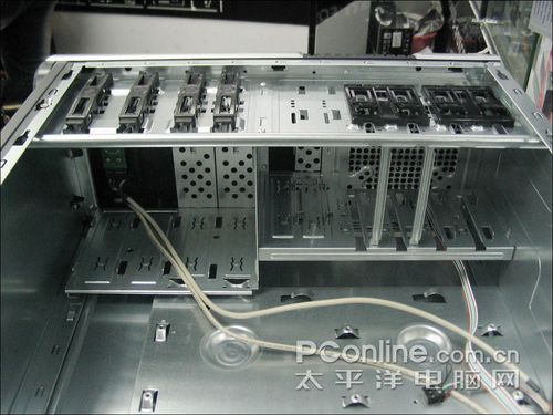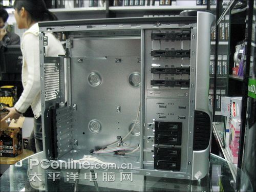 富士康 V150机箱一共具有4个光驱位,6个3.5英寸硬盘位以及2个软驱位,可以轻松的满足普通用户的扩展要求,内部设计整齐合理,机箱内存空间充足,可以方便用户的扩展和合理布局,通风条件良好。