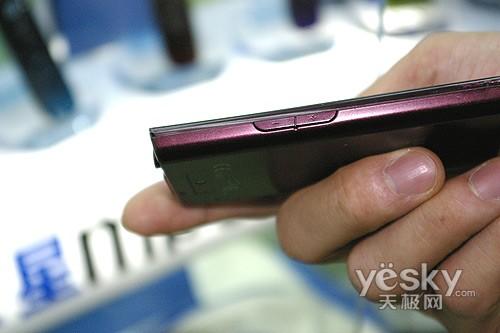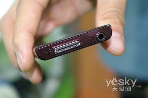 屏幕下方是一个小圆,在开关机器和连接电脑的时候会发出红色的光芒,十分惹眼。正面下方是三星特有的USB接口及耳机接口。机身左侧安放了HOLD锁定键及电源开关按钮,而右边则是音量调节按钮,除此之外没有其他按钮,毕竟触控屏幕才是最大的按键区域。