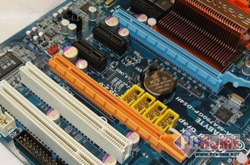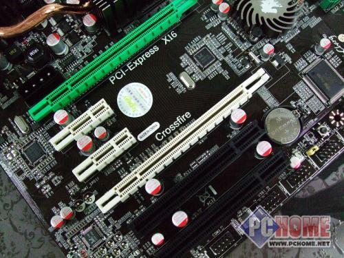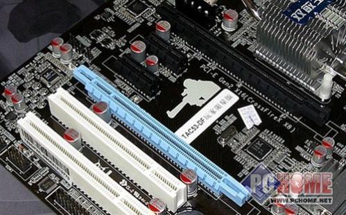 主板提供了2条PCI-E x16显卡插槽,为PCI-E 2.0规格。支持双卡交火,支持Hybrid CrossfireX技术。板载了PCI-E分频芯片,能够自动识别显卡模式,并没有采用我们在普通主板上看到的跳线的方式,方便了消费者。