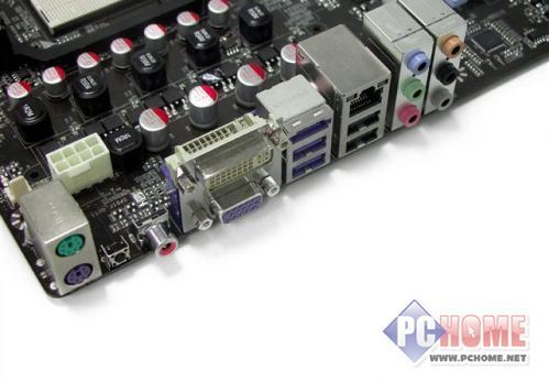 主板提供了4个USB端口以及1个eSATA接口,方便接驳便携设备。提供了DVI/VGA双视频输出,另外还配备了CMOS清空按键,方便超频使用。
