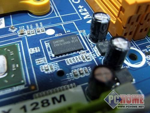 来看看北桥部分的真身。RS780和旁边的板载128M显存颗粒共同组建了当前最强悍的整合显示模块。板载显存部分使用了来自三星的128M大容量显存颗粒,与共享内存(UMA)共同组建Sideport+UMA模式的最高性能组合,可以将HD3300显示核心的性能再提升一个档次。