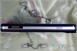 手机的左侧下方是该机的Fast-Port接口,数据接口、充电接口和耳机接口三合一,上方还有一个小小的按键,那是音乐播放的快捷键。手机的右侧上方是音量调节的快捷键,下方的拍照快捷键被设计成了圆柱状,拍照快捷键旁标有M2字样,表示该机只支持扩展卡扩展的,需要打开电池后盖才能看见插槽。