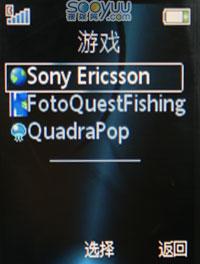 游戏方面,索尼爱立信S302内置了两款游戏:FotoQuestFishing和QuadraPop,前者就是海底探秘,为海底的鱼拍照的一款游戏,后者就是Q版的俄罗斯方块。