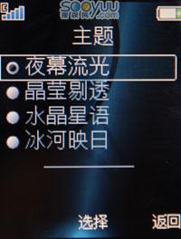 手机的基本功能跟以往的索尼爱立信手机差别不大,该机内置了四款主题,分别是:夜幕流光、晶莹剔透、水晶星语、冰河印日。这几款主题并没有更换手机的菜单图标。