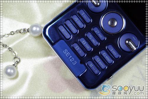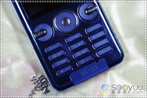 手机的数字键采用的是塑料材质,在黑暗中可以看见背景光也是蓝色的,按键跟机身尺寸有关,有点小,间距还比较合适。数字键下方还有话筒,由于是过程样机的缘故,这里我们还能看见SE123字样,正式上市的时候这里应该是S302c字样。