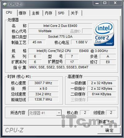 酷睿2 E8400基于45nm Wolfdale核心,默认主频高达3GHz,外频333MHz,倍频为9x,拥有6MB大容量二级缓存。可以看到默认工作状态下,酷睿2 E8400的工作电压仅1.088V左右。