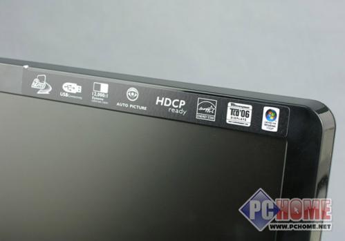 这款产品右上角贴有相当多的产品规格标识,从左至右依次为灰阶2ms响应时间、USB接口、12000:1动态对比度、Auto Picture画面增强技术、HDCP协议、能源之星低功耗、TCO'06安规认证和vista Premium认证。