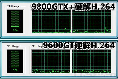 CPU占用率上来看,如果不明确告诉你哪个是9800GTX+,估计你是无法区别出两款显卡的差距,因为大数据媒体流的处理,并不需要更多的流处理器解码,16以及32个流处理器足以应付硬件高清解码,这是GPU进行高清解码的优势所在。