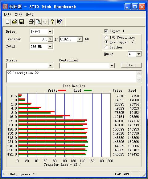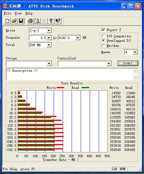 ATTO Disk Benchmark是由ATTO公司出品的一款磁盘/网络性能测试工具,该软件使用了4MB的测试包,数据包按0.5K、1.0K、2.0K直到到1024KB进行分别读写测试,测试完成后数据用柱状图的形式表达出来。很好的说明了文件大小比例不同对磁盘速度的影响。