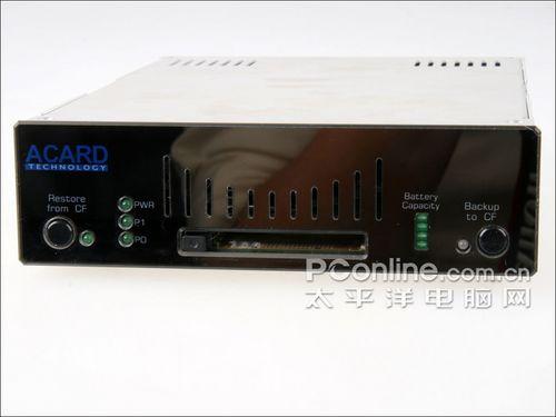 在ACARD ANS-9010的前面板上,提供LED灯号显示,方便辨识电源、内存、锂电池电量、SATA装置、备份等工作状态,一组CF插槽及双向备份键。