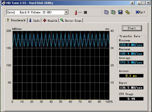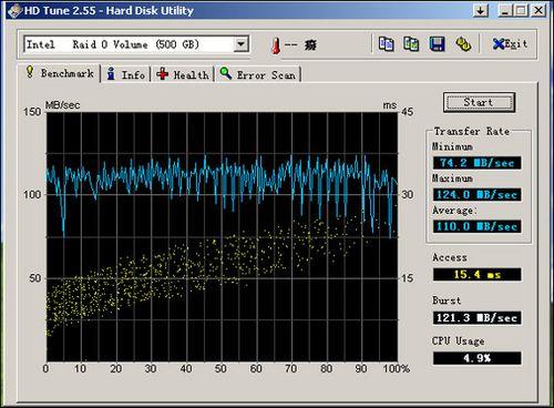 首先使用HD Tune2.55测试软件,它能检测硬盘的传输率、突发数据传输率、数据存取时间、CPU 使用率、健康状态,温度及扫描磁盘表面等。另外,还可详细检测出硬盘的固件版本、序列号、容量、缓存大小以及当前的传送模式等。