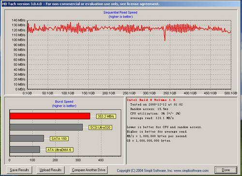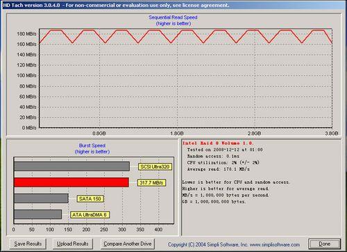 在另一套HD Tach软件测试下,ACARD ANS-9010平均读取则是得到178.1MB/s、突发传输速率达到317.7MB/s,而希捷双碟装500GB硬盘的平均读取为123.1MB/s、突发传输速率为353.2MB/s。