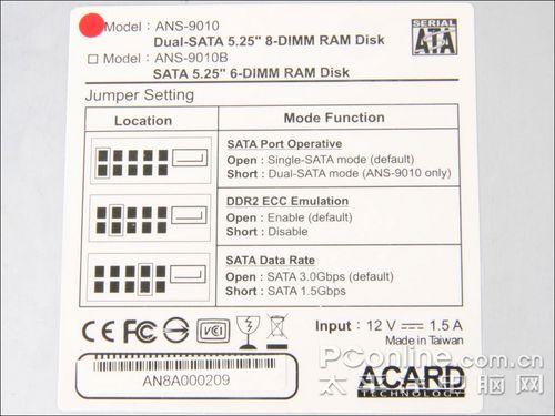 ACARD ANS-9010在后方传输接口上采用了两组独立的SATAII传输端口,因为ANS-9010可以额外通过调整跳线的方式,将一个RAMDisk划分成两个独立的RAMDisk,并且会将总内存容量平均分配到这两个RAMDisk上,这样可以提供给玩家们用来组Raid 0的功用,发挥出RamDisk的性能。