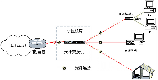 如图,网络核心设备是放置于小区机房或大厦机房的光纤交换机,该光纤交换机通过光纤以1000M/100M速率与Internet边缘路由器或汇集交换机相联,实现小区网络接入Internet。光纤交换机通过光纤和点对点的方式以双工100M速率与放置在用户家中的光网络单元或内置光纤以太网卡相联,实现用户通过光纤高速接入Internet。光纤交换机与光网络单元的链接是选择单纤双向方式 。