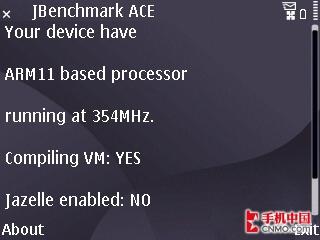 首先,我们为诺基亚E63手机安装了ARM与JBenchmark公司合作开发的,专门用于测试配备ARM架构中央处理器的手机,并显示CPU详细信息的JBenchmark ACE(ARM CPU Extimator)。通过下面的截图我们可以看出,诺基亚E63手机采用了一颗ARM11系列的中央处理器,测试频率为354MHz,略微低于官方公布的数据。