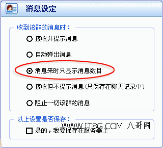 建议大家在使用这项功能时将图1设置窗口中的“是的,我要保存在服务器上”一项勾取,这样,即使您在其它电脑上登录QQ时,群消息的设置也会自动生效。
