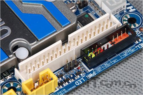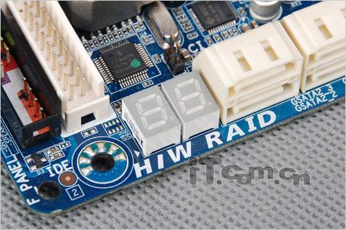 在很多DIY玩家的使用过程中,往往都是把平台裸露在桌面上而不是放置于机箱内部,因此很多中高端主板都会在主板上设置一些常用的快捷键,这款技嘉的GA-X58-UD5主板也不例外,在主板内存插槽附件我们可以看到具备开机功能的快捷键,对于玩家而言还是比较实用的,而在磁盘接口旁边还设置了传统的DEBUG指示灯。