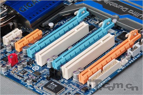 在扩展插槽方面,这款技嘉的GA-X58-UD5主板同样也是目前市场里的顶级水平,总共为用户提供了三条PCI-E显卡插槽,能够满足中高端玩家们组建多显卡互联系统的需求,而一条PCI-E X1插槽、一条PCI-E X4插槽和2条传统PCI插槽也足以满足玩家们硬件扩展的需要。
