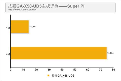在英特尔的新一代平台上,最吸引DIY玩家们注意无疑就是基于Nehalem核心架构的Core i7处理器,因此在针对X58芯片组主板进行的测试中,处理器的性能是一个非常重要的组成部分,在本次评测中,小编主要采用了Sisoft Sandra 2008、Super Pi以及CINEBENCH R10三款不同软件对系统的处理器性能进行考验。最终的测试成绩体现出这款技嘉GA-X58-UD5主板对于Core i7处理器的良好支持,可以看到Sisoft Sandra 2008的得分已经达到同类型产品中的较高水平,而Super Pi的成绩展现了Core i7处理器强劲的浮点运算能力,CINEBENCH R10中,1CPU和XCPU的成绩体现出Core i7多核心之间的良好协作。