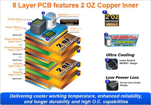 熟悉电子产品的网友应该都知道,作为主板的基板,PCB板中可以分为基于铜质的信号层、电源层、接地层以及采用其他材料的绝缘层,在以往的主板产品上,其PCB板的内部纯铜层一般都采用1盎司的设计,而技嘉的超耐久3代主板在PCB板纯铜层则是采用了2盎司的设计。技嘉的超耐久3代技术之所以采用更高的2盎司纯铜设计,主要目的是为了实现更加有效的散热效果,通过增加PCB板纯铜层的材料,可以让主板工作时所产生的热量得到更高效率的传到分散,从而降低主板整体的温度。采用了2盎司纯铜设计之后,主板不仅得到了更有效的散热,同时在电流供应方面也有很大的改进,对于主板的超频能力以及稳定性也起到了明显的改善作用。