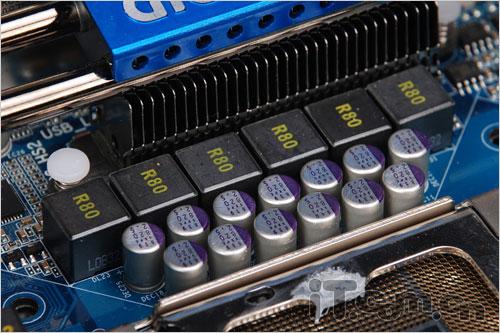 除了采用高达十二相的供电模块设计之外,这款技嘉的GA-X58-UD5主板在供电部分的用料也是可圈可点的,不仅采用了全固态电容和封闭式铁素体电感,同时还选择了低电阻的MOSFET,从而可以最大限度地降低供电模块的电阻。