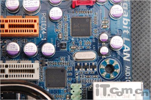 板载芯片部分,这款技嘉的GA-X58-UD5主板所采用的都是Realtek的产品,其中音频部分选择了Realtel的ALC889A八声道音频芯片,而网络部分则是选择了两颗Realtek的RTL8111D千兆网络芯片,这样的用料对于中高端玩家的需求而言已经完全够用了。
