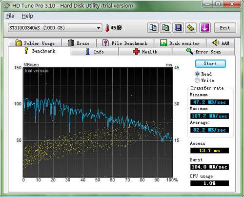 由于技嘉的这款GA-X58-UD5主板采用了最新的ICH10R南桥芯片,因此在磁盘性能方面与英特尔以往的主板产品相比有了明显的提高,首先在数量上,这款技嘉GA-X58-UD5主板所提供的SATA接口总数达到了10个,而在这一部份,小编将会通过HD Tune和HD Tach两款不同软件的测试来展现技嘉GA-X58-UD5主板在磁盘性能上的进步。在搭配了希捷的7200.11 1TB SATA接口硬盘之后,这款技嘉的GA-X58-UD5主板在磁盘性能方面的表现已经达到了目前市场里的主流水平,无论是平均传输速度还是突发传输速度,都完全足以满足中高端玩家们的需要,而较低的硬盘寻道时间也能给用户提供强劲的磁盘性能体验。