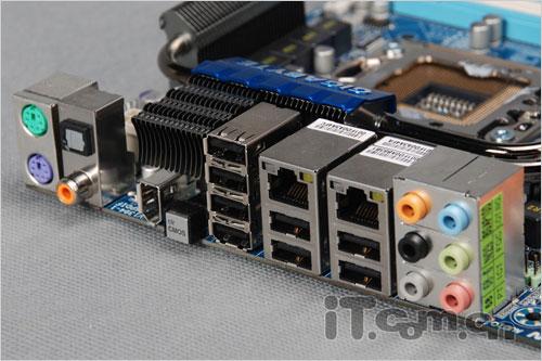 作为一款定位于中高端玩家的主板产品,这款技嘉的GA-X58-UD5主板在I/O接口部分的设置自然也是相当丰富的,不仅提供了传统的PS2键鼠接口、USB2.0接口、网络接口以及音频接口,同时还具备了同轴接口、光纤接口以及IEEE1394接口,另外在I/O接口部分还具备了一个用于清空CMOS数据的快捷键,对于玩家来说相当方便。