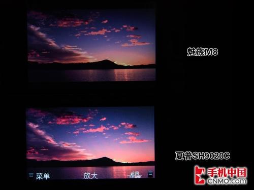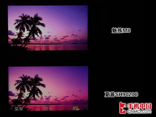 从下面的对比图中我们可以看出,其实夏普SH9020C获胜的原因除了屏幕亮度高之外,还有一个重要因素就是其1670万色的屏幕色数。很明显魅族M8手机表现的这张图片在太阳光晕的处理上过渡非常不自然,而夏普SH9020C则表现恰恰相反。