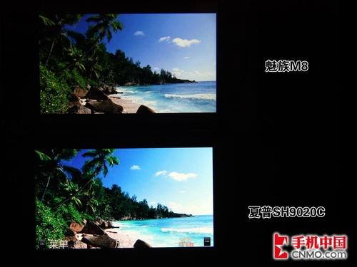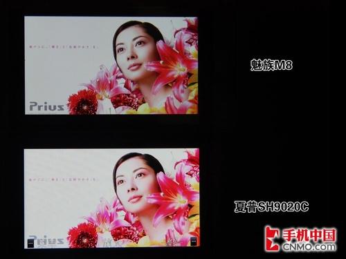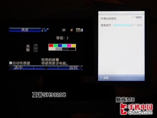 从下面的最高屏幕亮度对比组图中我们可以看出,夏普SH9020C凭借超高的亮度和对比度、世界领先的液晶技术,当仁不让的以绝对优势战胜魅族M8手机。
