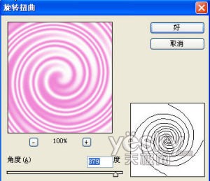 做完这步以后,画布中便出现了红白相间的条纹,对此条纹图像再进行滤镜-扭曲-旋转扭曲操作,在选钻扭曲窗口中,将角度值调到适合位置便可。