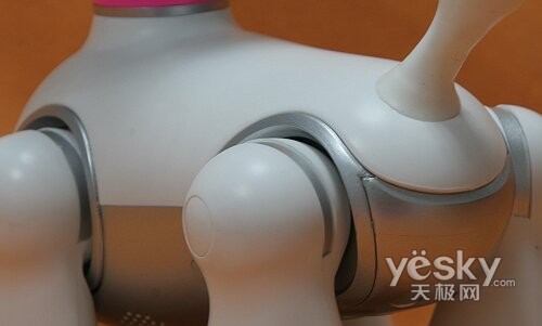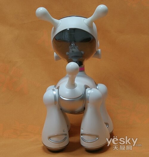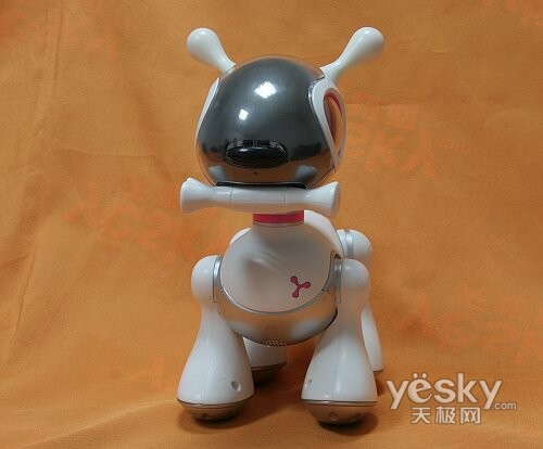 从正面由上往下看,首先是Mio的耳朵,往下,是头部感应器。感应器下方是按钮鼻子、麦克风、嘴部感应器,而侧面则是Mio大大的眼睛,这对眼睛可会有超过100种的眼神哦。再往下看,可以看到下巴处还设置有下巴感应器,要知道狗狗都是很喜欢让人摸它的下巴的哦。胸前,设置了心跳彩灯,当抚摸Mio脑袋的时候,彩灯也会伴随闪亮,并带有滑动声音效果。转过来Mio的体下,能看到声音出口、状态开关和重设按钮。再看Mio的背部,首先是能随心情变化的尾巴,同时背部也内置了感应器提供触摸感应功能。Mio可谓全身上下都按照了真实狗狗来设计。