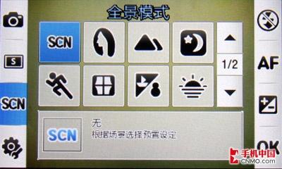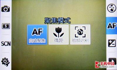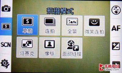 这次三星M8800手机采用了大图标来现实一些界面信息。在拍摄模式中,M8800包含有单拍、连拍、全景、微笑快拍、马赛克、像框、面部链接七种,而其中面部链接与微笑快拍的功能差别并不大,都是方便镜头更好地捕捉人像的面部表情。