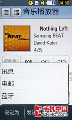 三星M8800手机的音乐播放界面非常简洁,而且大部分操作不需要进入到菜单中,直接在主界面下就可以操作完成。比如:音效调整目录、播放模式、随机播放等等功能。