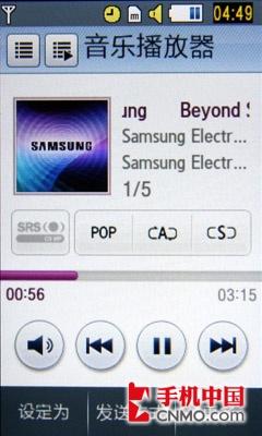 三星M8800手机可以支持WMA, AAC, eAAC, eAAC+格式的文件,音乐播放器支持唱片封面显示以及根据作者,唱片,曲风等进行分类查找,你可以创建自己的播放列表。