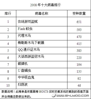 十大恶意网站排行榜,表格来源于电脑报(www.shudoo.com)2008年第50期F版