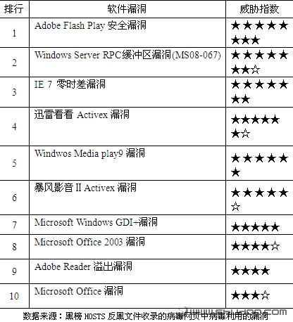 同时,年末突发的IE7零时差漏洞也打了微软和广大IE用户个措手不及,几乎与此同步,网站就出现了利用该漏洞的恶意攻击页面。此外我们还发现发现诸如老版迅雷看看、暴风影音Ⅱ等去年的软件漏洞在今年依然大范围流行,被不少恶意网站所利用实施攻击,究其原因与用户安全意识不强,疏忽常用软件的及时更新有必然关系。这些软件的用户保有量众多,因此继续登上今年的十大漏洞排行榜。