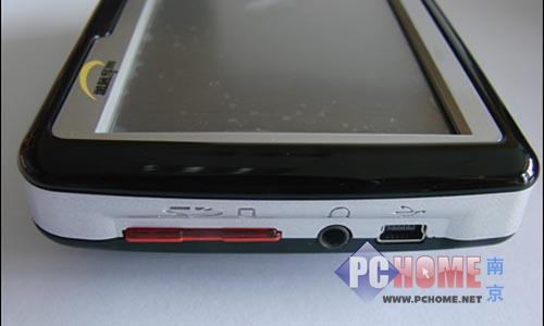 坤达J530的机身三围为117.5×74×23mm,外壳采用了炭精黑色的工程塑料,制作与组装都比较精细,与一般导航仪不同,坤达J530的顶部有一个类似田径场形状的圆台,该部件在坤达J530看起来非常独特,它的作用是给GPS芯片提供更好的GPS信号接收。该机整个机身为无按键式设计,四周布置了SD卡槽,GPS接收天线,菜单键,音量调节轮,电源键,耳机孔以及Mini-USB接口。其中音量调节轮的设计在使用中给人感觉非常方便,能以更快的速率随时调整音量。