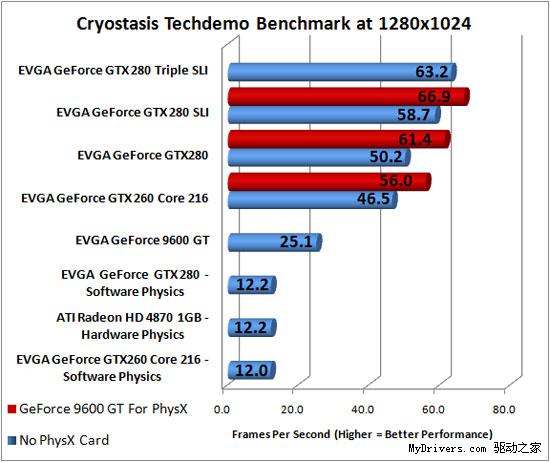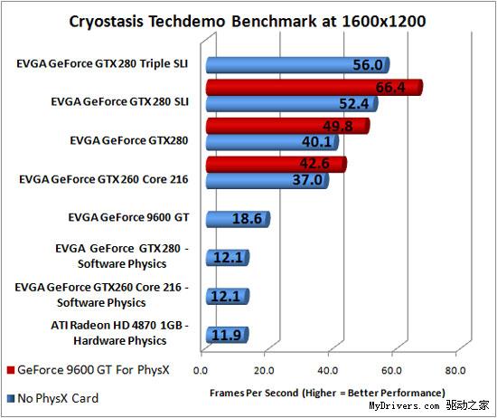 如果只有一块显卡,同时开启PhysX软件加速,即使GTX 280/260的成绩也都非常可怜,只有9600 GT不开启PhysX加速的一半。