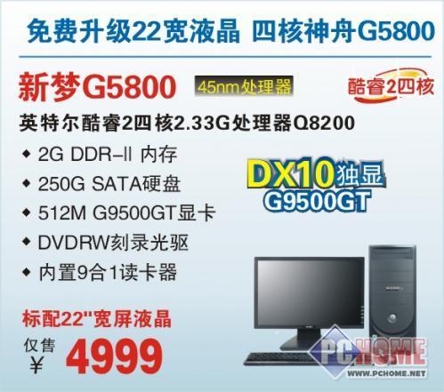 神舟新梦G5800一上市,就以其4M二级缓存的45nm四核心处理器Q8200在各地引起热销狂潮,用“芯”开始带给你不一样的程序运行速度。它各项配置均达到顶级,2G DDR-II内存,512M G9500GT独立显卡。更为惊喜的是从即日起购买神舟G5800,即可将显示器升级为22宽神舟液晶,全面提升整机操作体验,价格仅为4999元,为你迸发更多超值精彩。
