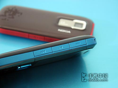 诺基亚5130 XpressMusic音乐手机的机身左侧为音乐播放控制键,右侧为音量增大/减小按键和Micro SD存储卡插槽。