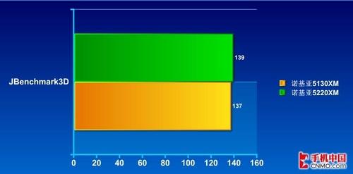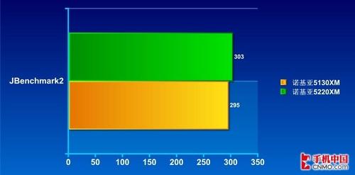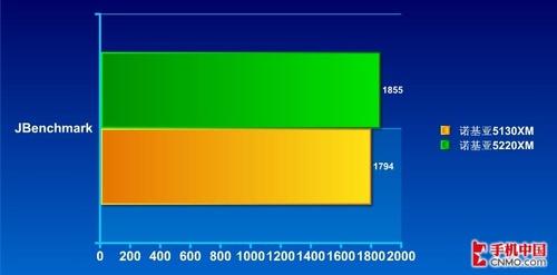 在测试完软件的兼容性后,笔者还对5130XM进行了JAVA性能的测试,并调出了以前5220XM机型的数据和其进行了简单比较。通过JBenchmark系列软件的测试,两款手机的最终数据相差不多,最大分差也只在几分上下,因此基本处于同一水平线。