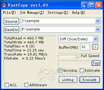 Fastcopy实际传输速率测试:写入11.01MB/s;读取19.8MB/s。