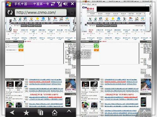 网络功能是商务手机的重要测试项目,三星i900内置了著名的Opera浏览器,配合Wi-Fi网络可以畅游互联网。内置的Opera浏览器是三星定制版,拥有一些特殊功能。比如在浏览页面状态下,右侧有一个无形的滑动条,可以通过手指触摸放大或者缩小网页,配合图片我们能够看到最后放大的效果。这样可以非常方便的浏览网页,看清楚每一个文字。配合128MB的内存,浏览网页十分流畅,拖动页面和放大缩小都能够流畅完成。